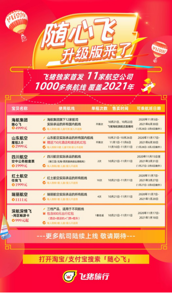 据了解,此次首发的“随心飞”升级版囊括了海航集团下属12家航司、山东航空、深圳航空、四川航空等,从经济舱到公务舱,从全国无限次卡到温暖跨年之选尽在其中。21日开始,打开飞猪App,或上天猫、支付宝搜索“随心飞”即可直达购买会场。