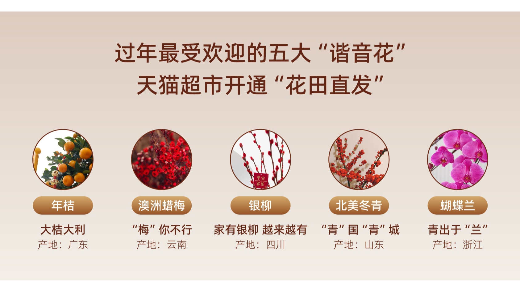 天猫年货节期间,天猫超市与云南、广东、四川、山东、浙江等五个花卉大省的400个基地合作,把线下的“花市”搬到线上,直接原产基地直发送货上门,最快次日达。