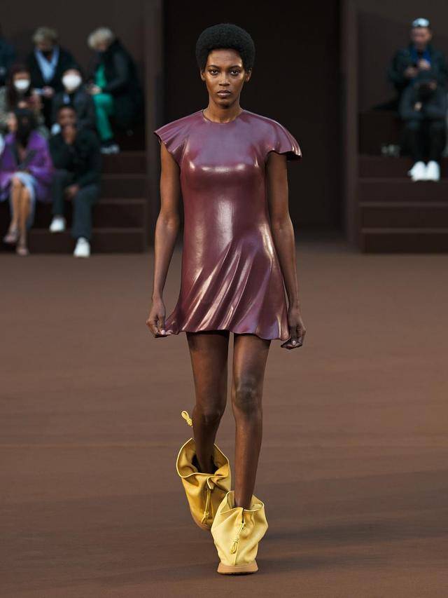 LOEWE 2022秋冬女装系列,此次时尚大秀运用了皮革、毛毡、乳胶、花呢、针织、3D打印纤维、丝绸、树脂等材质。动势被捕捉,物件被定格。模制的皮革连衣裙与毛毡胸衣,带有嘴唇图案胸甲或气球胸罩的垂坠连衣裙。夹克在颈部或胸前被堆起。裙子扬起的褶摆,凝固在时间中。
