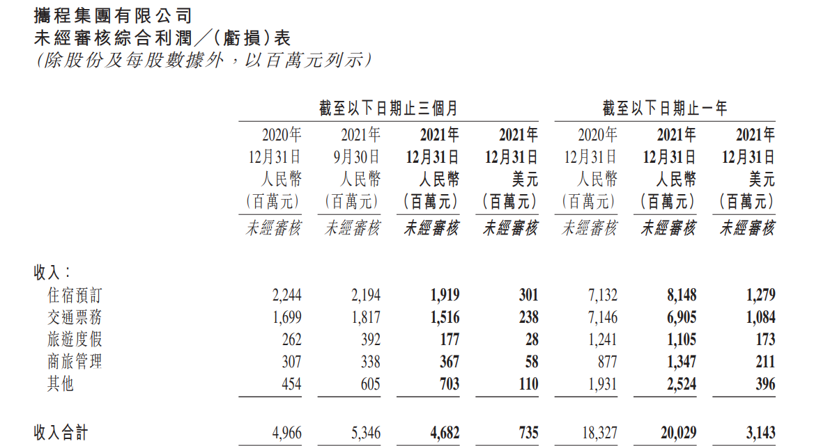 财报显示,2021年携程集团全年净营业收入为200亿元,同比增长9%;归属于集团股东的净亏损为5.5亿元,相比2020年亏损32亿元,大幅收窄。