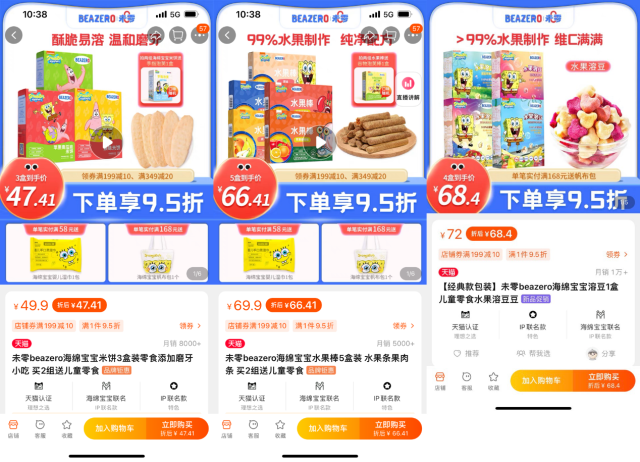 过去的一年,一批满足了新消费趋势的新品牌在天猫上诞生。beazero未零旗舰店于去年9月正式入驻天猫,其品牌负责人檐儿告诉记者,“在今年的618,他们的销售成绩已经达到了行业Top4,旗下beazero海绵宝宝米饼、水果棒、溶豆等618爆款商品,在7月份的销售量都有接近万单的良好表现”。