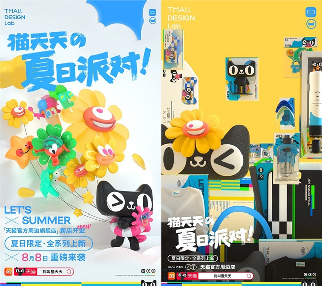 据了解,本次天猫官方周边店TMALL DESIGN Lab旗舰店也在8月同步开店,《收藏960万平方公里的夏天》首期发布所有数字藏品都以天猫官方周边店新品“猫天天的夏日派对”实物周边系列一同绑定免费赠送。