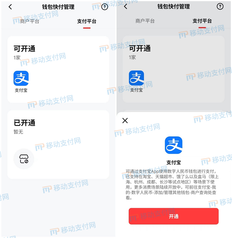 12月12日,数字人民币App(试点版)“钱包快付管理”新增“支付平台”,与“商户平台”并列。点击“我的”——“钱包快付管理”,可看到左侧为“商户平台”,右侧为“支付平台”,其中显示“可开通”的平台目前仅有1家,为“支付宝”。