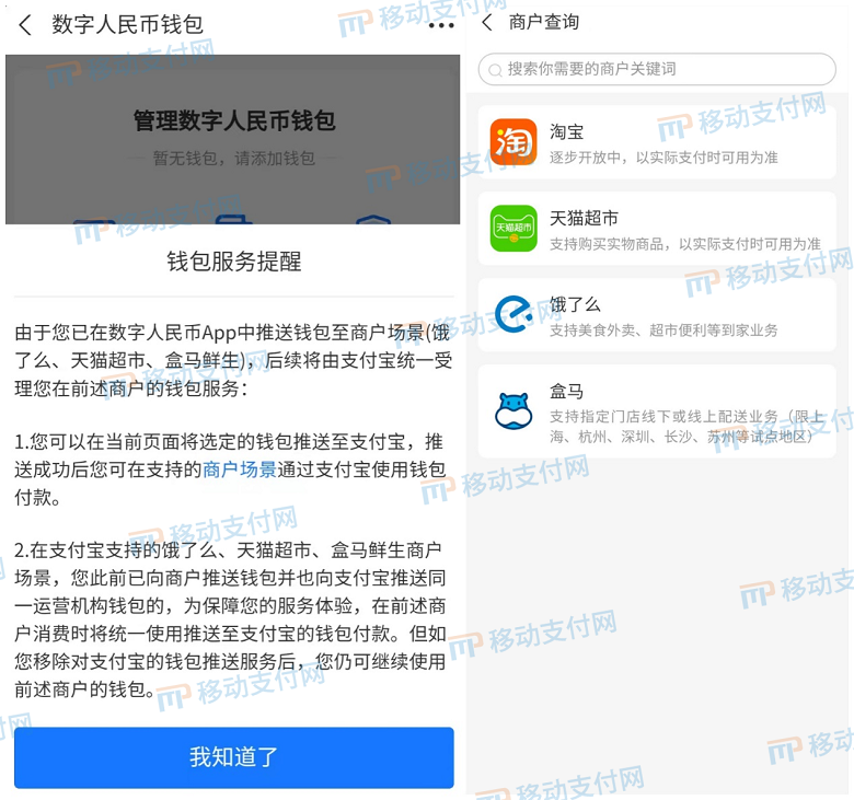目前在天猫(已开始分批次上线)、天猫超市、饿了么以及盒马(限上海、杭州、成都、长沙等试点地区)等场景,支持通过支付宝使用数字人民币钱包进行支付。